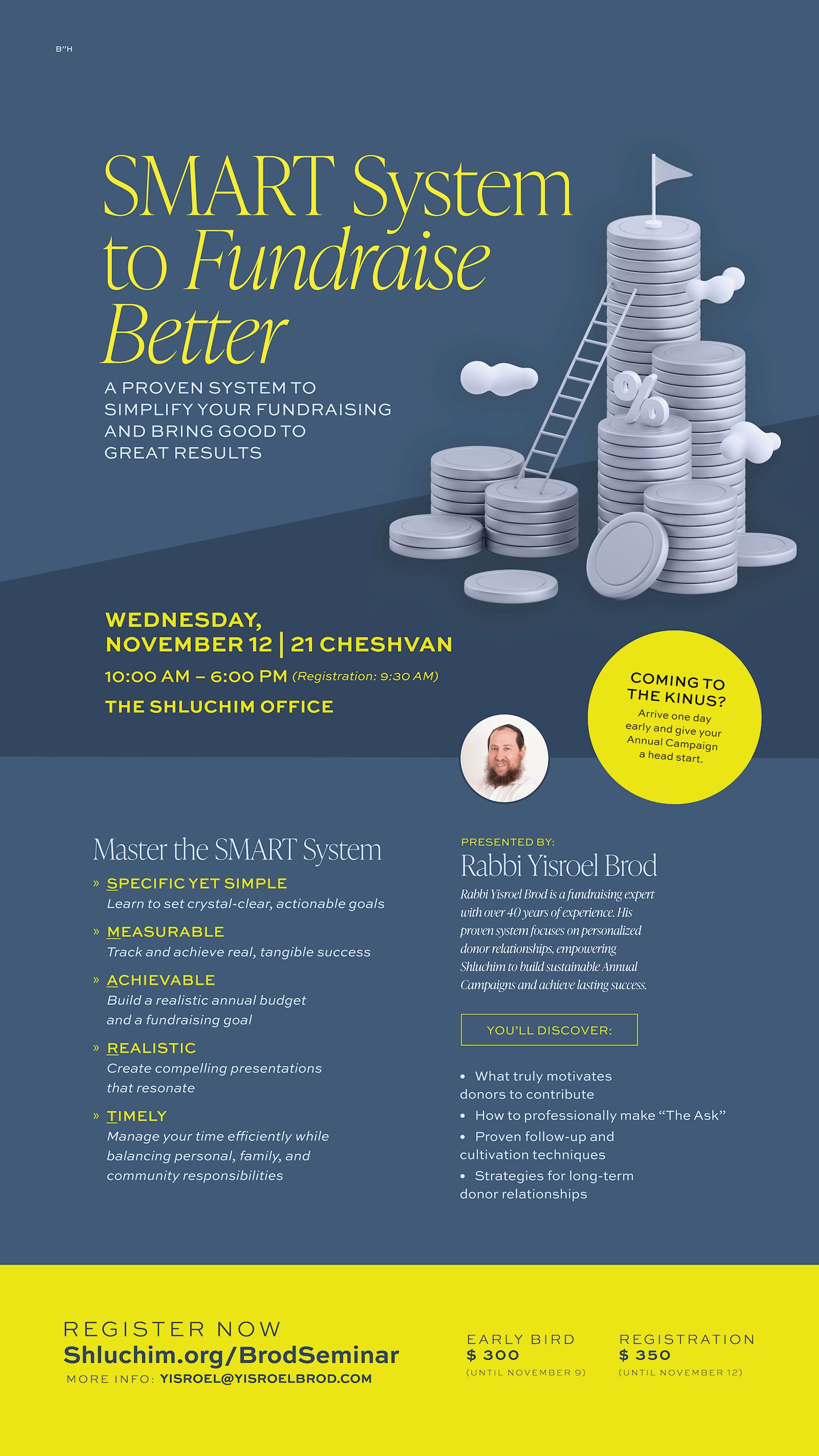 A PROVEN SYSTEM TO SIMPLIFY YOUR FUNDRAISING AND BRING GOOD TO GREAT RESULTS Date: Wednesday, November 12th, 2025 - 21 Cheshvan 5786 Time: 10:00 AM to 6:00 PM. Registration and refreshments 9:30 AM Location: The Shluchim Office - 4th FL.